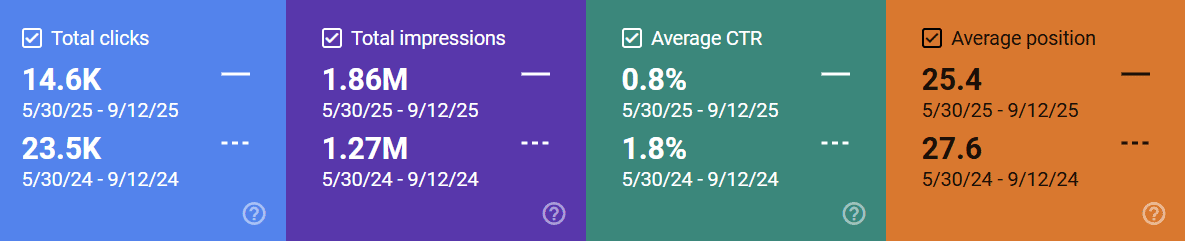 Hey Reader, I've been thinking about lost traffic recently, because I keep seeing charts like this when I'm researching for clients: Same story every time. Traffic was climbing steadily until around June, then everything changed. The drop happened fast. For other clients, I see something even more frustrating happening. They are growing in visibility while hemorrhaging traffic at the same time. Look at these metrics from another client. Comparing May - September 2025 to the same period last year, this company saw: π +59m impressions But despite showing up in more searches at better positions, they lost visits: π -1% click-through rate Why? In May 2025, Google rolled out AI overviews. Click-through rates dropped across the board because people were getting answers served directly. But here's the thing: the traffic didn't disappear. It just stopped flowing to websites like it used to. So where does it go? And how do you get it back? That's what I'm covering in a live workshop on October 15th at 2pm EST.β