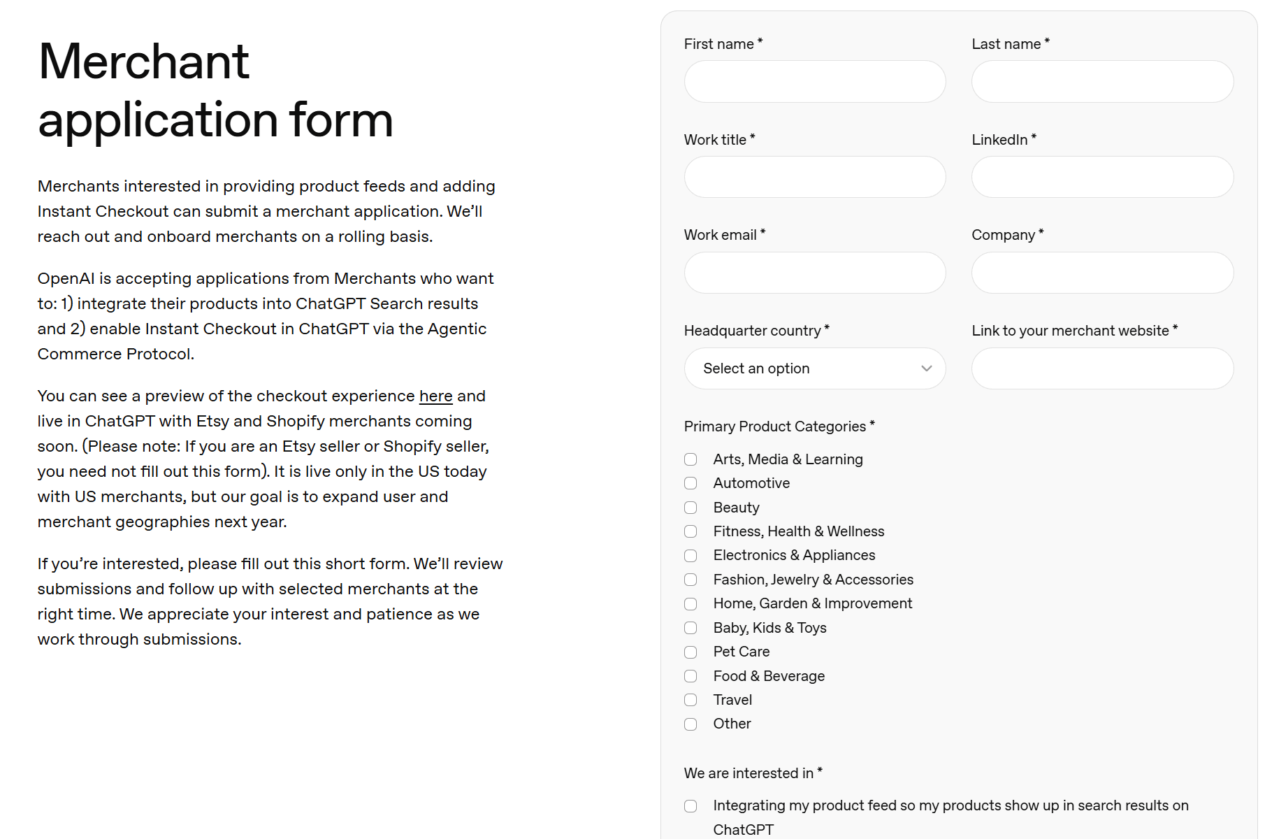 Hey Reader, Just a quick email today to show you something interesting I found while doing some research for the Search Evolution Strategy. I want to make sure that clients who sign up are getting as much traffic from AI search as possible. Especially traffic that converts. So I've been looking into how people are using ChatGPT and LLMs to do their shopping. Perhaps you've noticed, if you ask ChatGPT for a product recommendation, it sometimes pulls up specific recommendations. For example, when I asked ChatGPT this prompt: Part of its very in-depth answer included this: I wanted to know why it chose specific products over others. And that's what led me to this page, which has a lot of information that addresses that very question. Of course, it's all written by some clever marketing folks at ChatGPT, so I take it all with a large grain of salt. Regardless, I want my clients to show up in these kinds of searches. And that's why I'm so glad I discovered what's at the bottom of the page. But what really interests me is the form at the bottom of the page. πIf you scroll down, you'll come to this form, where you can put your name on a list to apply for a merchant application. This is where anyone can sign up to test out ChatGPT shopping and provide feedback on their soon-to-be-released Instant Checkout feature,. β This is one of those SEO no-brainers. I'll be recommending this to all of my clients, and since you are a follower here at Inkwell Content, I thought you might want to know about it as well. It's at the bottom of this page. Let me know if you try it! And if you have more questions about showing up in AI search, you can always reply to an email or DM me on LinkedIn, or go here to see any recent emails you missed on the topic. - Liam P.S. Next week I'm announcing a new webinar about why so many businesses lost traffic in 2025, and what they can do to reverse that trend in 2026. Keep an eye out for that!